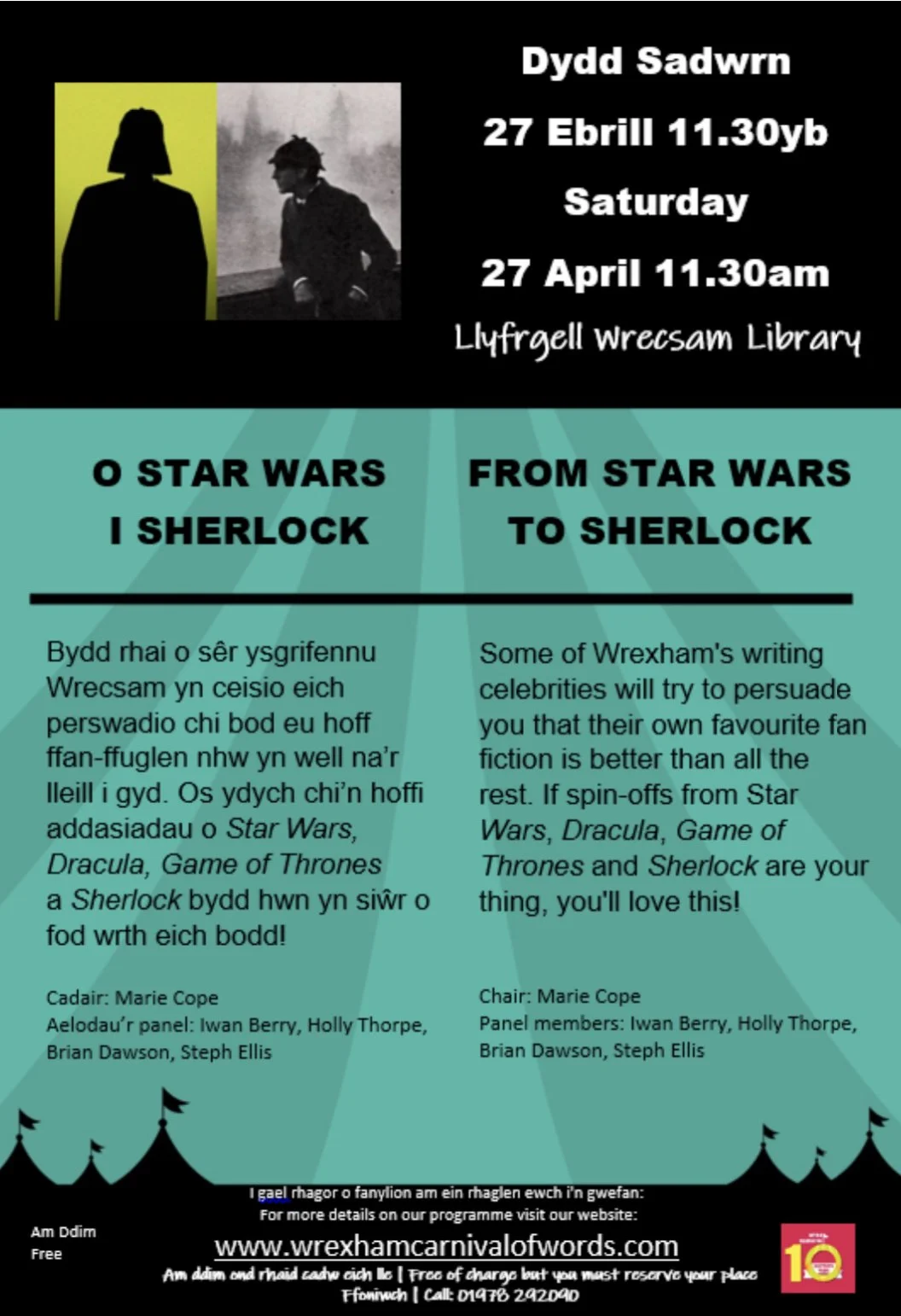 Holly has spoken at the Wrexham Carnival of Words as a panellist twice, including recently in 2024 to argue that adaptations and fanfiction of Sherlock are the best, and led a panel and workshop in the recent 2025 carnival.